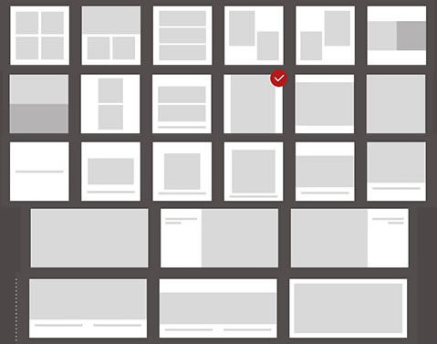 本文は1ページに1~4枚の写真配置が可能。「2ページで写真1枚の配置」もふくめてスクエアタイプなら24のレイアウトから選択できます。